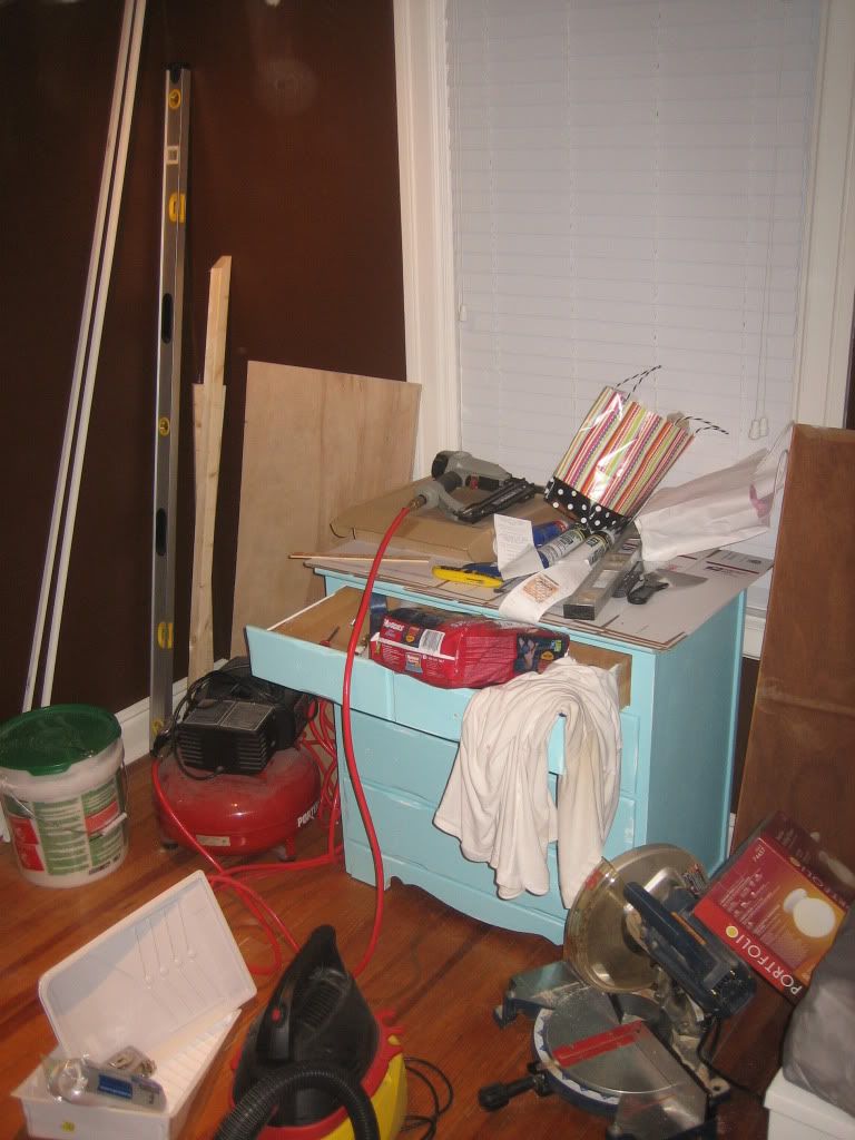 All of the nail holes were patched with wood putty and sanded down. The wood frame is for a changing table that will sit there, and a dresser (the beautiful blue one you see above) is going to get re-painted and will slide in under that.